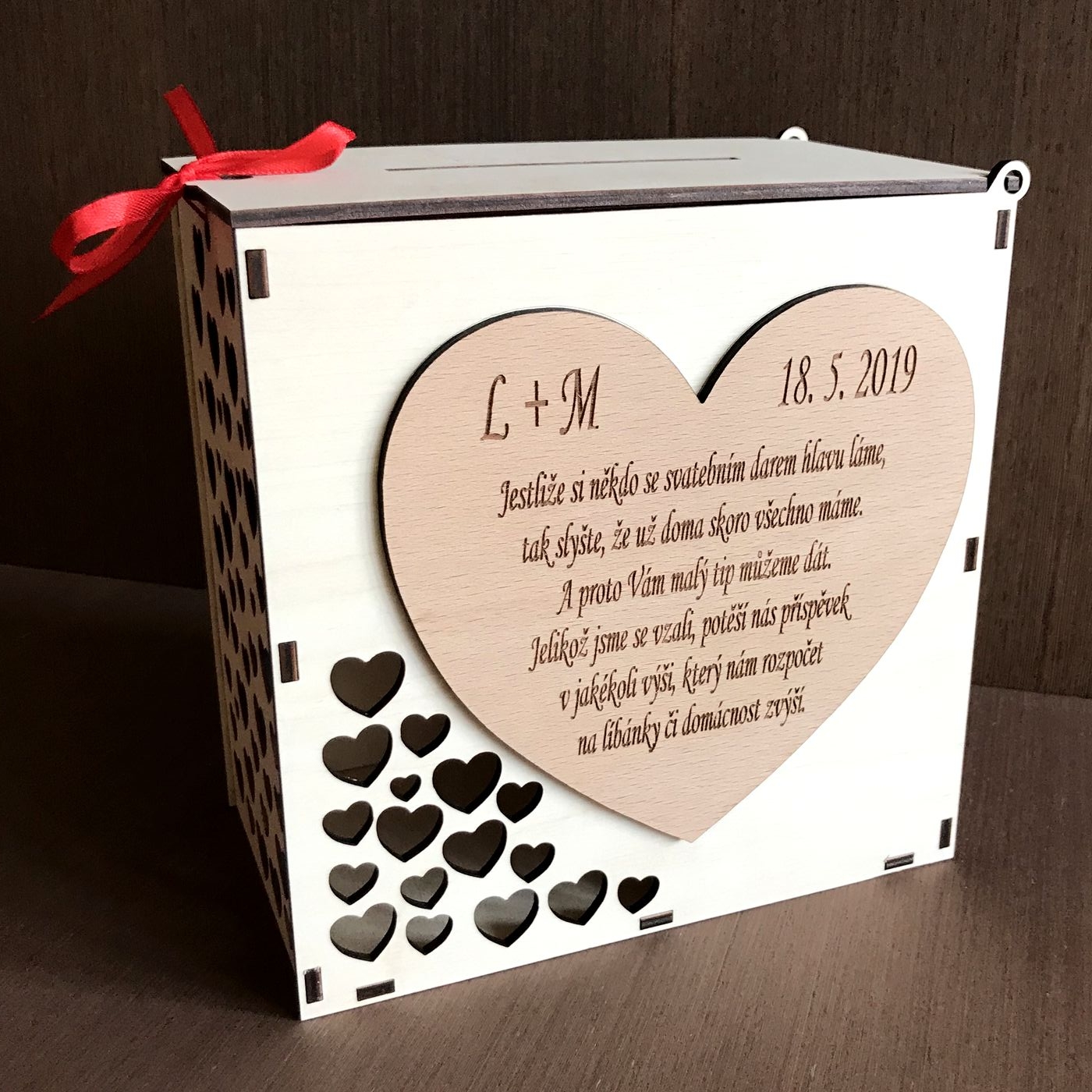 Svatební kasička na peníze - velikost 20cm x 20cm x 12cm - na kasičku Vám vygravírujeme text podle Vašeho přání. Kasička je zajištěná stuhou, ale můžete stuhu vyměnit za zámek (není součástí výrobku). :-)