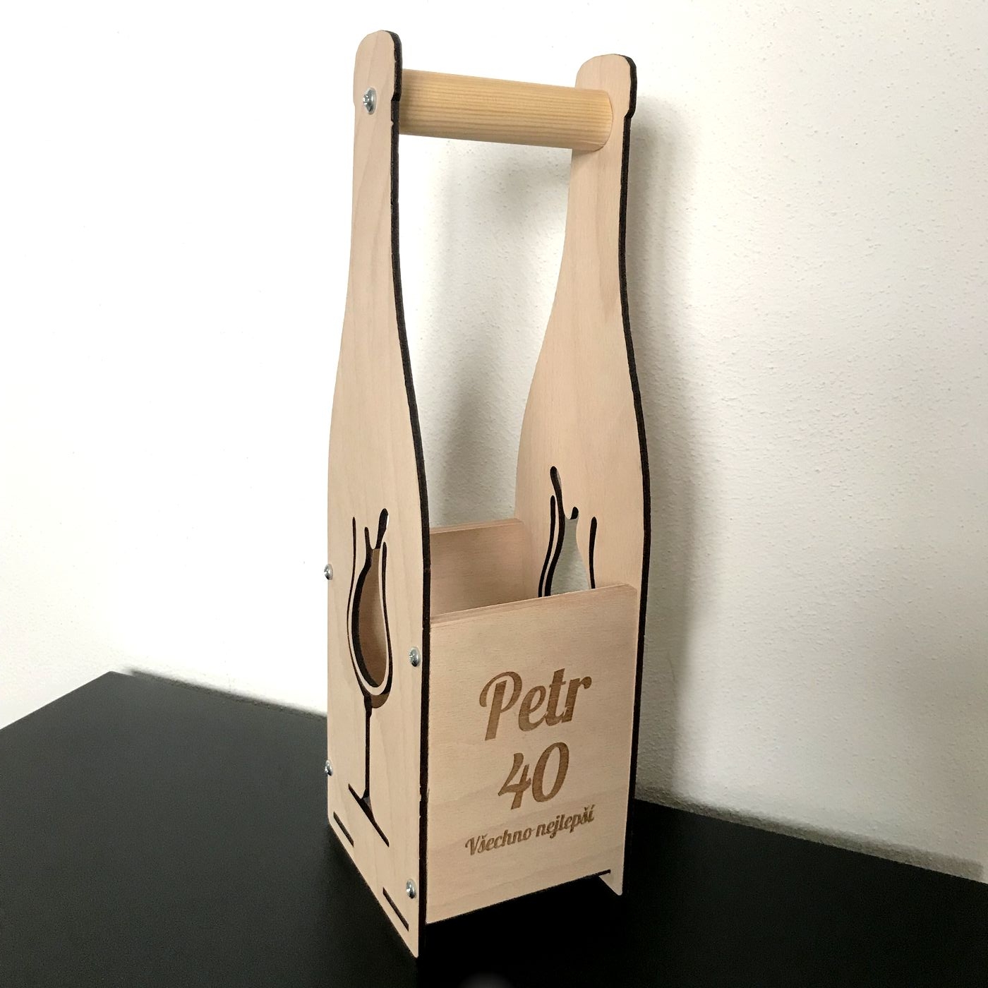 Dřevěná bedýnka na víno. Do bedýnky pasují všechny běžné druhy lahví (o maximálním průměru 100mm a výšce 330mm). Lahev s vínem ani sklenička není součástí produktu. Na bedýnku Vám vygravírujeme nápis podle Vašeho přání. Vhodný dárek pro každého milovníka vína. V nabídce také v luxusní tmavé barvě. :-)