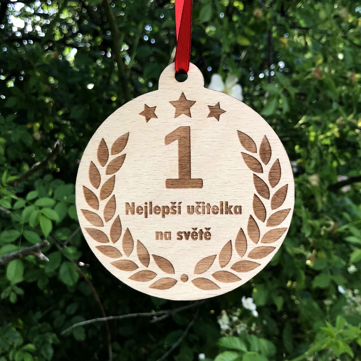 Dřevěná medaile Nejlepší učitelka/učitel na světě, o velikosti cca 10x10cm na kterou Vám zezadu vygravírujeme věnování podle Vašeho přání. :-)