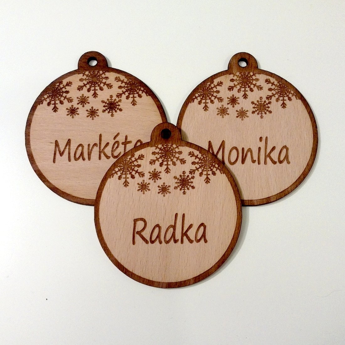Dřevěné vánoční ozdoby s vlastním textem. Ozdoby jsou vygravírované na 3-5mm tlusté překližce. Velikost ozdoby je 92x83mm. Průvlek má průměr 5mm.
