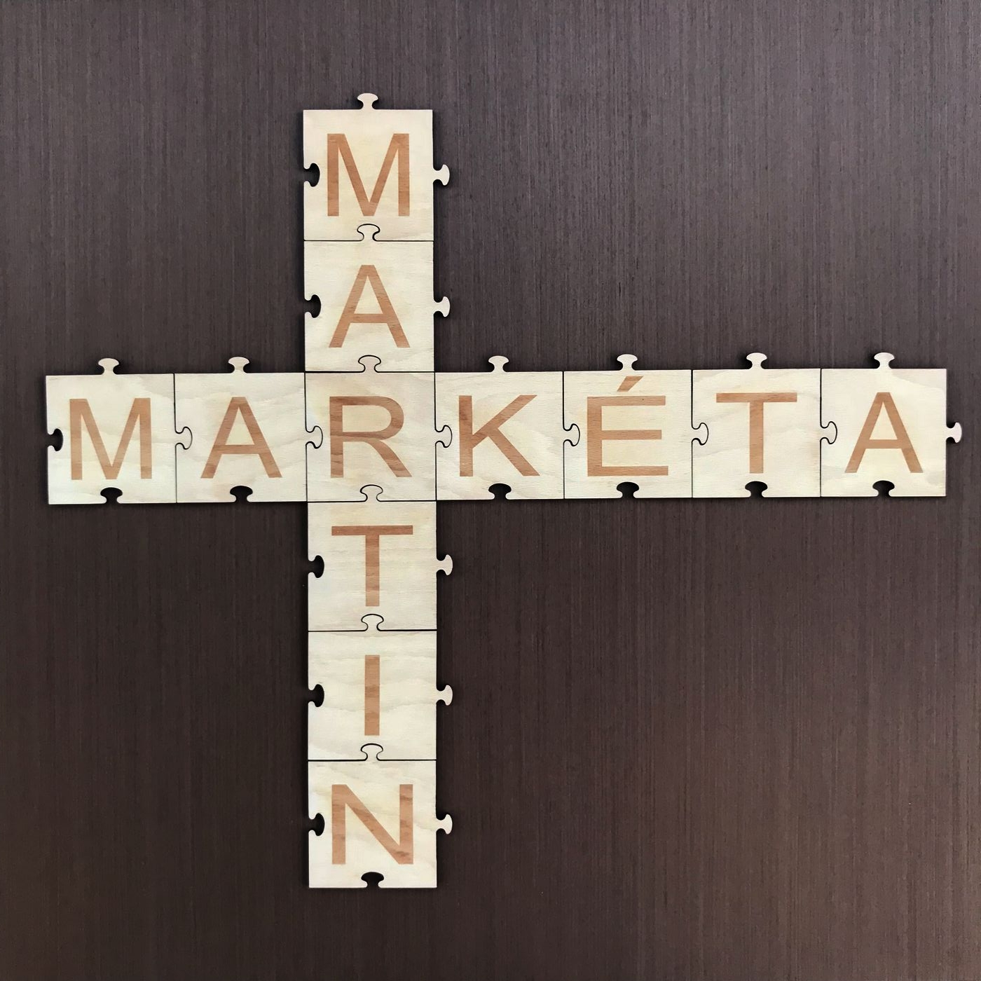 Puzzle s písmeny. Dřevěná dekorace vhodná k nalepení na zeď. Velikost jednoho dílku je cca 8 x 8 cm. Váš text prosím vložte níže a nezapomeňte prosím vybrat počet písmenek. :-)
