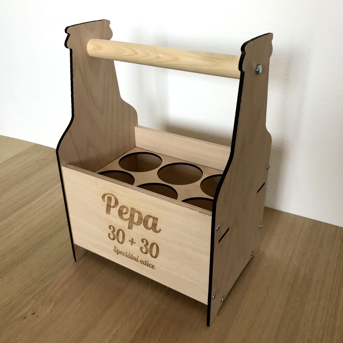 Dřevěná bedýnka na 6 lahví. Do bedýnky pasují všechny běžné druhy lahví (o maximálním průměru 70mm). Lahve s pivem nejsou součástí produktu. Na bedýnku Vám vygravírujeme nápis podle Vašeho přání. Vhodný dárek pro přítele, kamaráda, tatínka, dědečka, prostě pro každého správného muže. V nabídce také v luxusní tmavé barvě. :-)