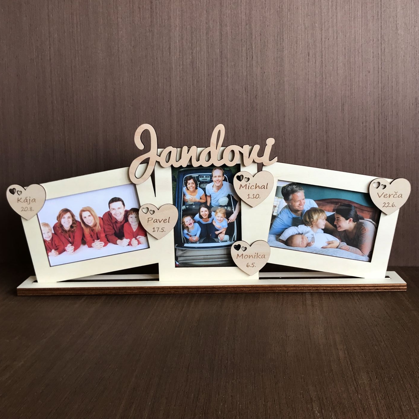 Rodinný rámeček na fotky se jmény a daty. Velikost fotek je 10x15cm. Ozdoby dodáváme nepřilepené, opatřené oboustrannou lepicí páskou, abyste si je mohli nalepit podle sebe. :-)